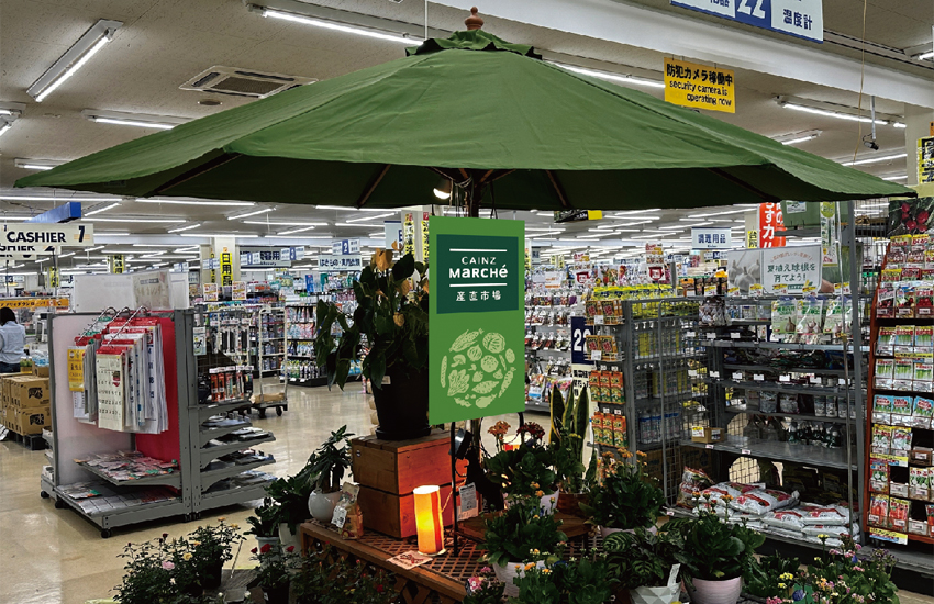 カインズ店内のマルシェ・コーナーに商品との調和を図りつつ独自性をもたせるため、