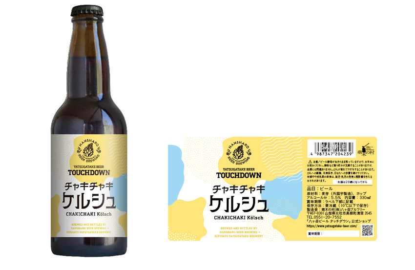 コラボビールのチャキチャキケルシェは夏の爽やかさを連想させる抽象パターンにカジュアルなドイツらしさも感じさせるカナ文字の組み合わせ。