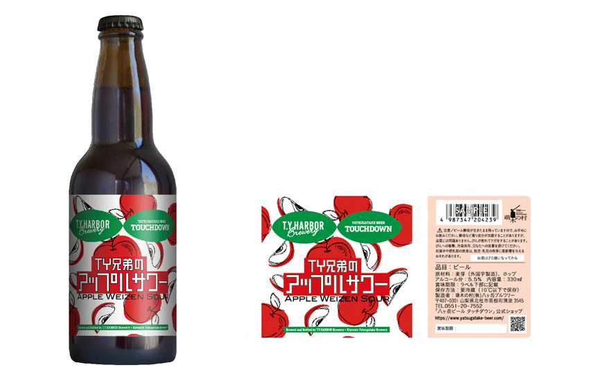 コラボビールのTY兄弟のアップルサワーは、酸味感豊かな果汁使用のフレッシュなイメージを躍動感のあるリンゴのイラストをリズミカルに散らしてカジュアルに表現したラベルデザイン。